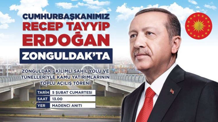 Cumhurbaşkanımız Sn.Recep Tayyip Erdoğan, Prof.Dr.Şaban Teoman Duralı Tünelleri ve Zonguldak-Kilimli Sahil Yolu başta olmak üzere bir dizi açılış ve toplantıya katılmak amacıyla Zonguldak'ımıza teşrif ediyor.