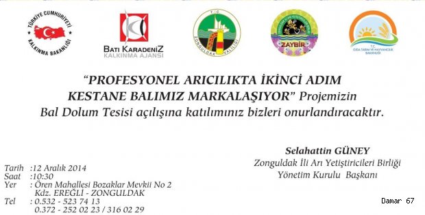 Zonguldak İli Arı Yetiştiricileri Birliği (ZAYBİR) Yönetim Kurulu Başkanı Selahattin Güney, yaptığı açıklamada, “Profesyonel Arıcılıkta İkinci Adım Kestane Balımız Markalaşıyor” isimli projenin Batı Karadeniz Kalkınma Ajansı (BAKKA) desteği ile tamamlandığını hatırlattı.